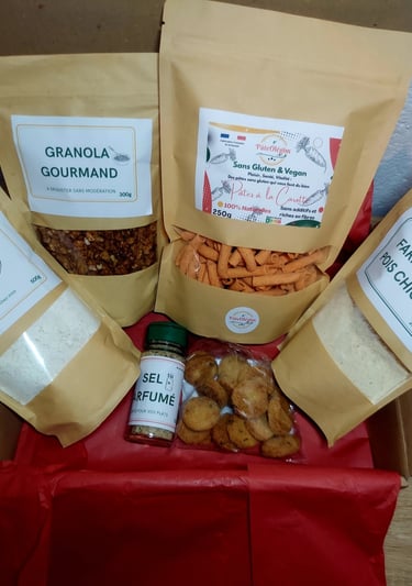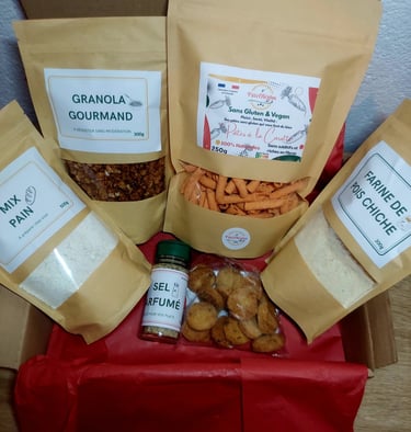 Cette box contient des pâtes à la carotte, farine de pois chiches, mix pour pain, sel parfumé, des mini cookies et granola gourmand.